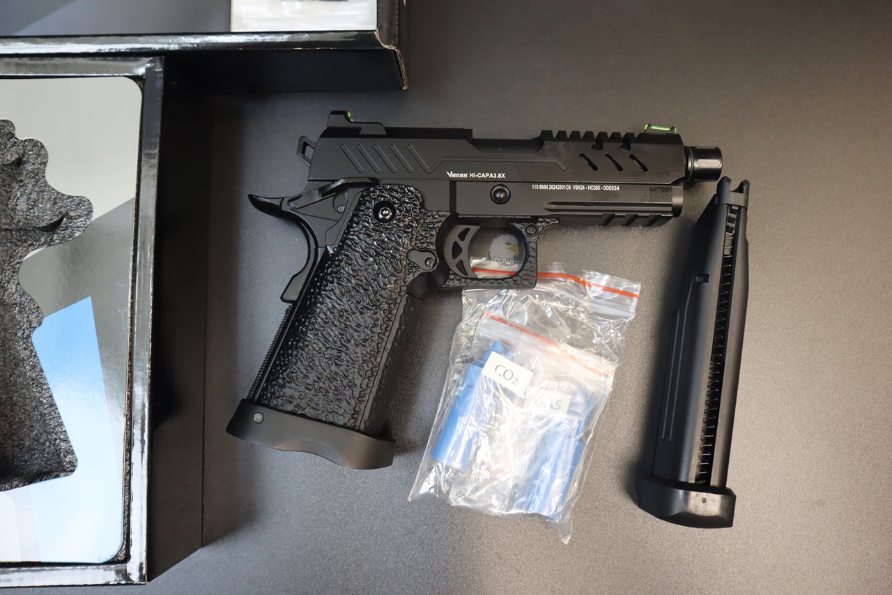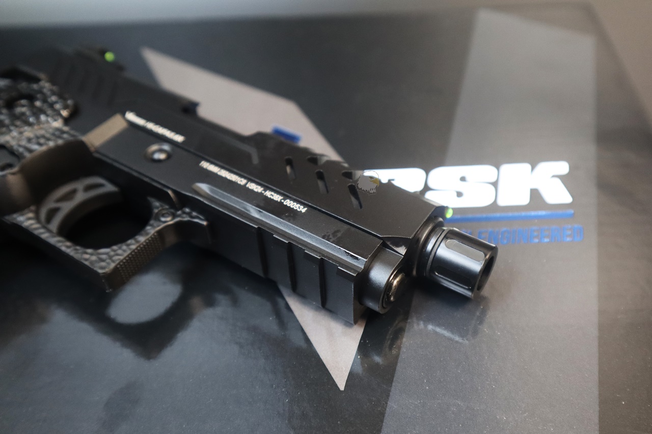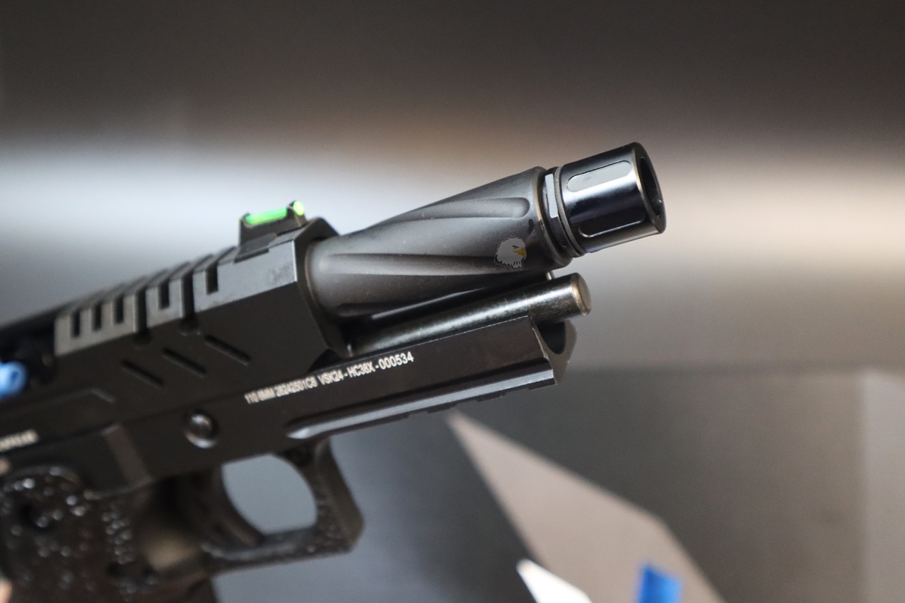 利用前皮卡汀尼附件導軌安裝火炬和雷射裝置。 VORSK Hi-Capa 配有隱藏在蓋子下的 12 毫米(順時針)/14 毫米(逆時針)螺紋適配器,使 VORSK Hi-Capa 可以安裝一系列槍管附件。 6.03mm 內管帶有螺紋,可容納延長的 VORSK AGENCY 抑制器管。