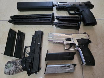 - 備註:1.we p226 黑色刻字 一槍兩匣$2000 外觀較陳舊 一匣微漏 不影響使用 2.we或kj p226 銀色刻字 一槍兩匣$3500 不太確定到底是we還是kj,但是彈匣通用we,而且現在新品好像沒在賣了不知道是不是算絕版品 3.we原力單連發大嘴鳥m&p附滅音管$2200 類似莉可莉絲瀧奈的造型,弄了個滅音管,兩長兩短匣 長匣現在沒