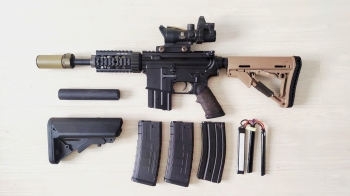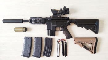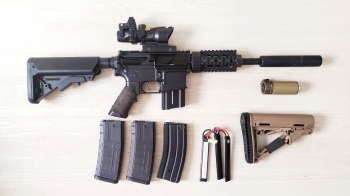 【物品售價】: $3200 不含鏡 【備註說明】: 1. 附長匣*3 + 短匣*1、三胞胎電池*1。 2. 黑色或沙色 後托/滅音器組 二擇一。 3. 槍身漆面有重新整理過,品項如圖。