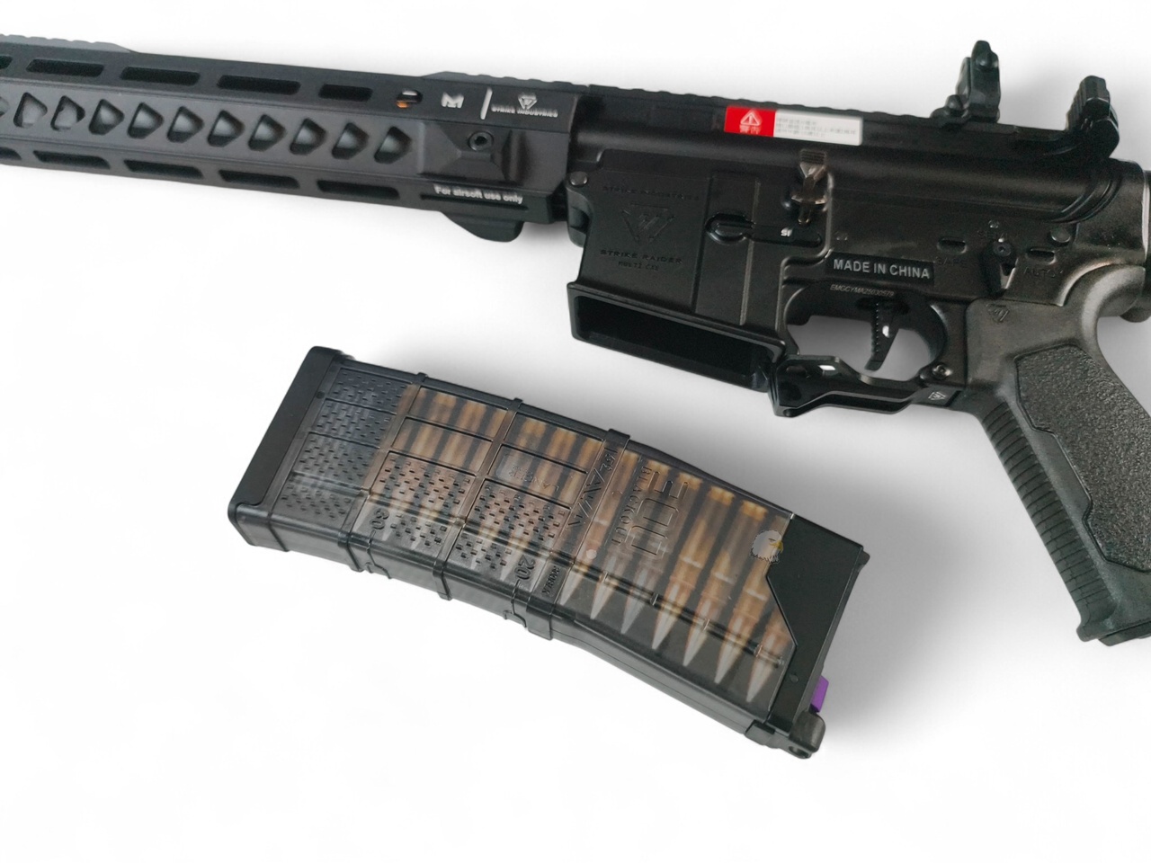 隨附彈匣為 LANCER SYSTEMS L5AWM 型瓦斯彈匣 / 鋼製螺栓扣、拆卸銷、槍栓連動座