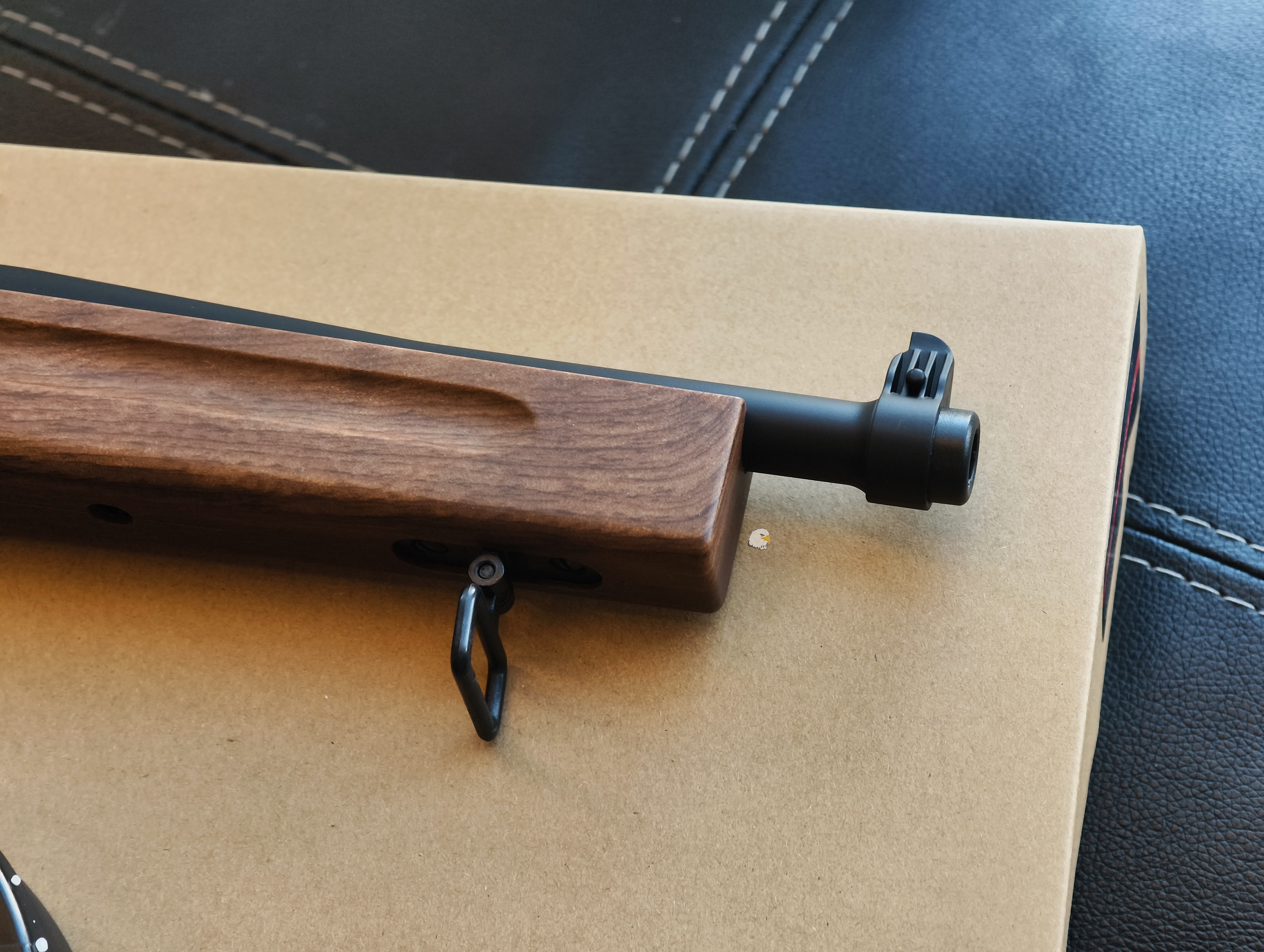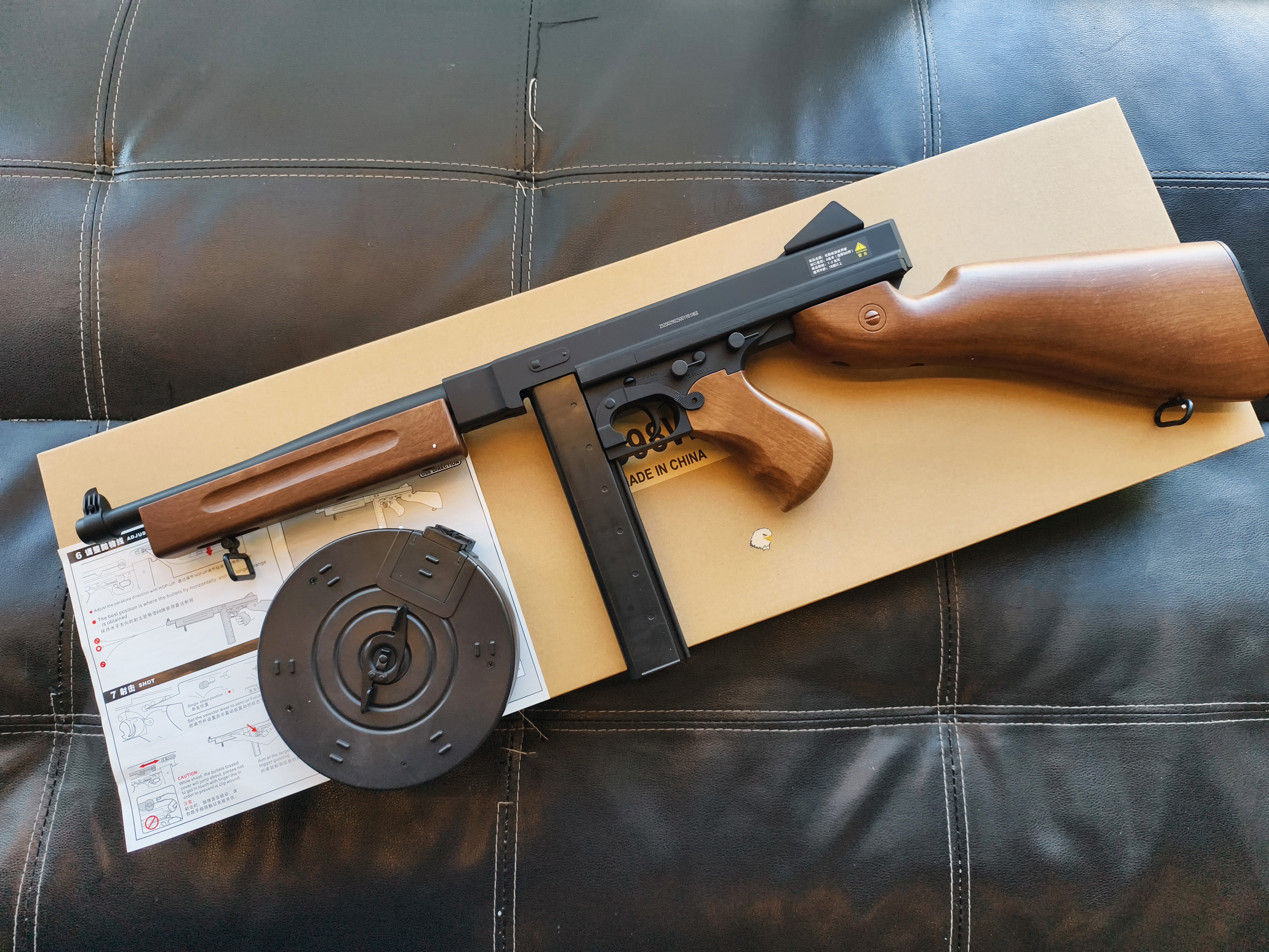 這款是M1A1湯普森,是較早型號的改良型。這款氣槍仿製品使用了仿木材質的槍托,而非真正的實木。#這把全塑膠材質