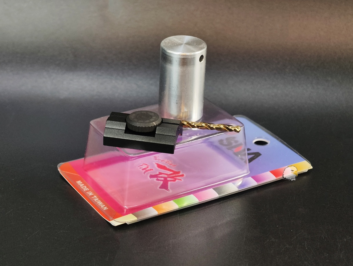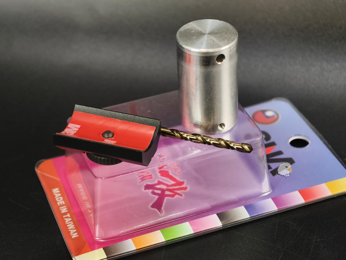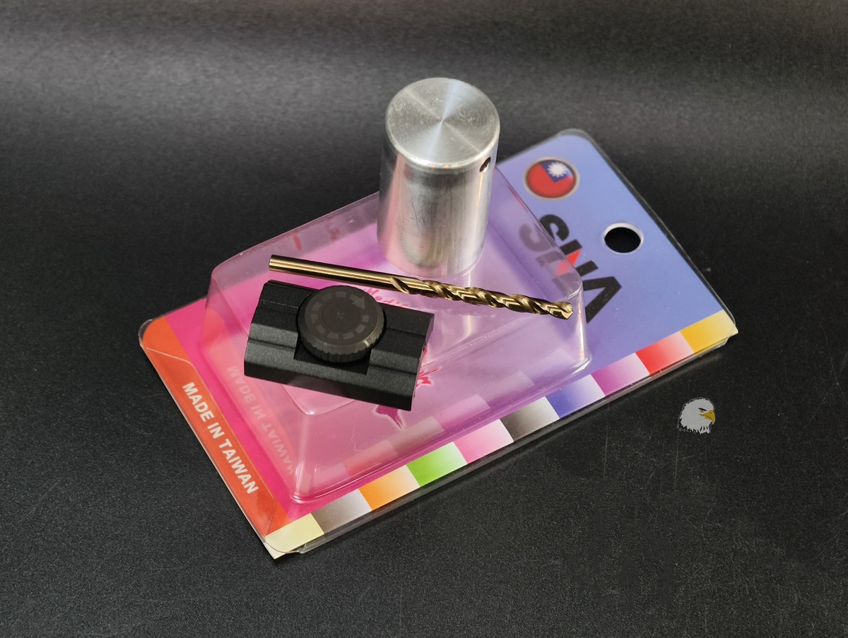 本體表面採用噴砂+陽極處理,轉輪為噴砂及硬黑處理,本產品贈送治具及鑽頭,可快速DIY鑽孔,