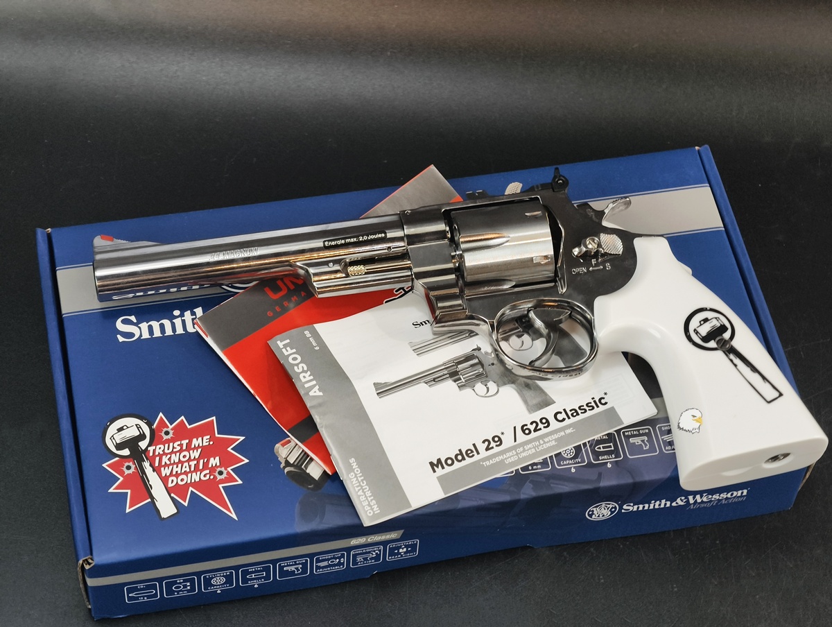 WG/Umarex 的 S&W 629 Trust Me 為 12g CO2 動力、6發彈殼式左輪、單動/雙動擊發與可調 Hop-Up,全長約 300mm、重量約 1.1kg 左右。