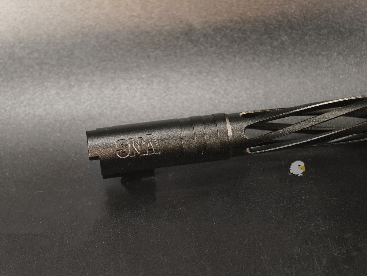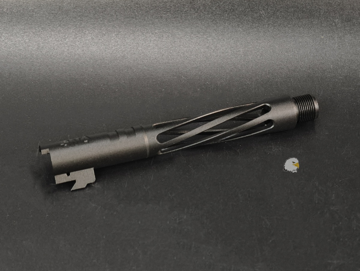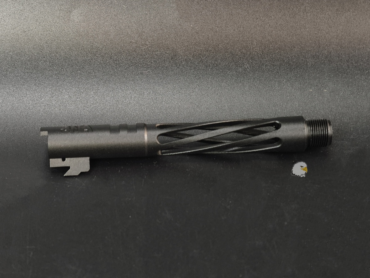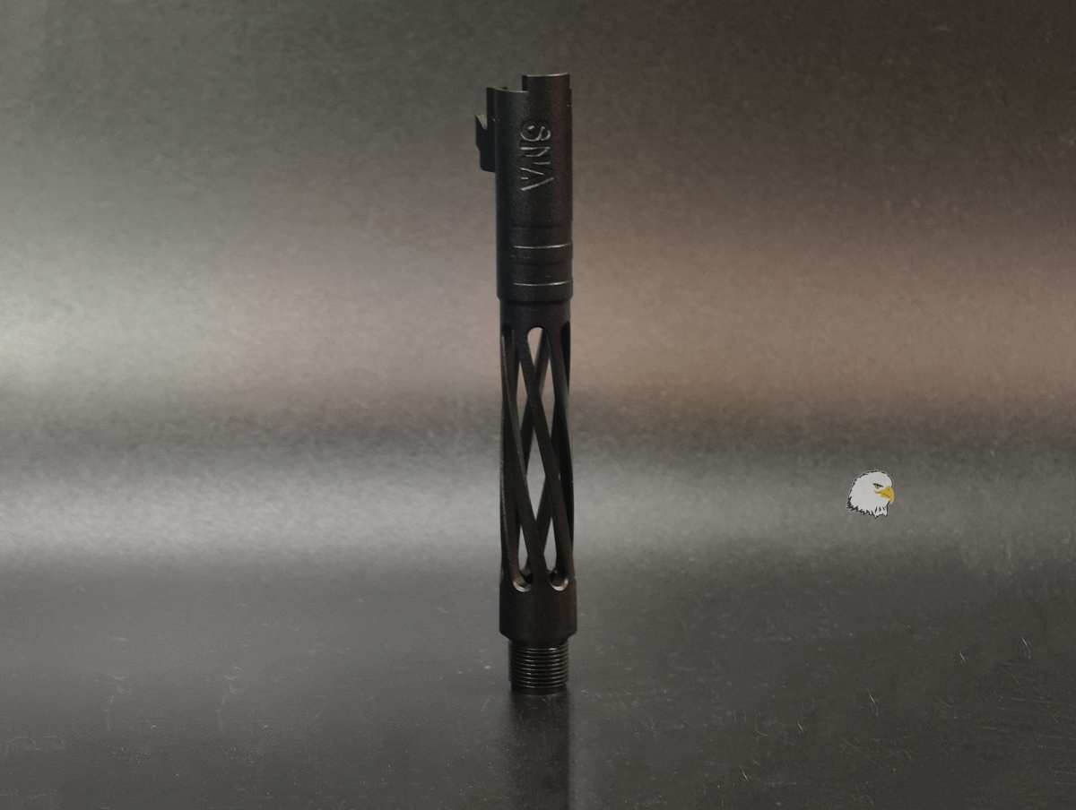 SNA 5.1 螺旋型外管採用黑色戰術風格設計,搭配螺旋鏤空造型,外觀更具競技感與改裝感。前端帶牙設計,可搭配對應規格的滅音管、火帽或轉接配件,是 Hi-Capa 5.1 改裝升級的實用外觀零件。