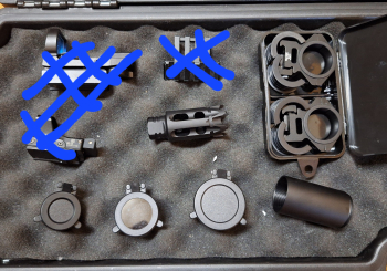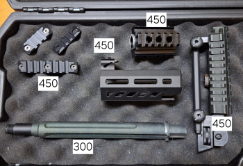 備註: [圖1上]:SMR416魚骨片,- APFG MPX 4.5吋護木(有固定插銷),- G&P M4CQB AEG 7吋外管 附正轉逆延長管,- M4 M16用三角瞄導軌,- 傑電產絕版提把導軌,- [圖2下]: 火帽,- 發現者34mm 1.25分體鏡橋 帶30和25mm轉接環,- 34mm彈蓋自帶壓克力保護片,- 30/41mm普通彈蓋,- 34mm消光筒,- 可交換:功能正常的RMR鏡座,背帶和背帶扣,機瞄